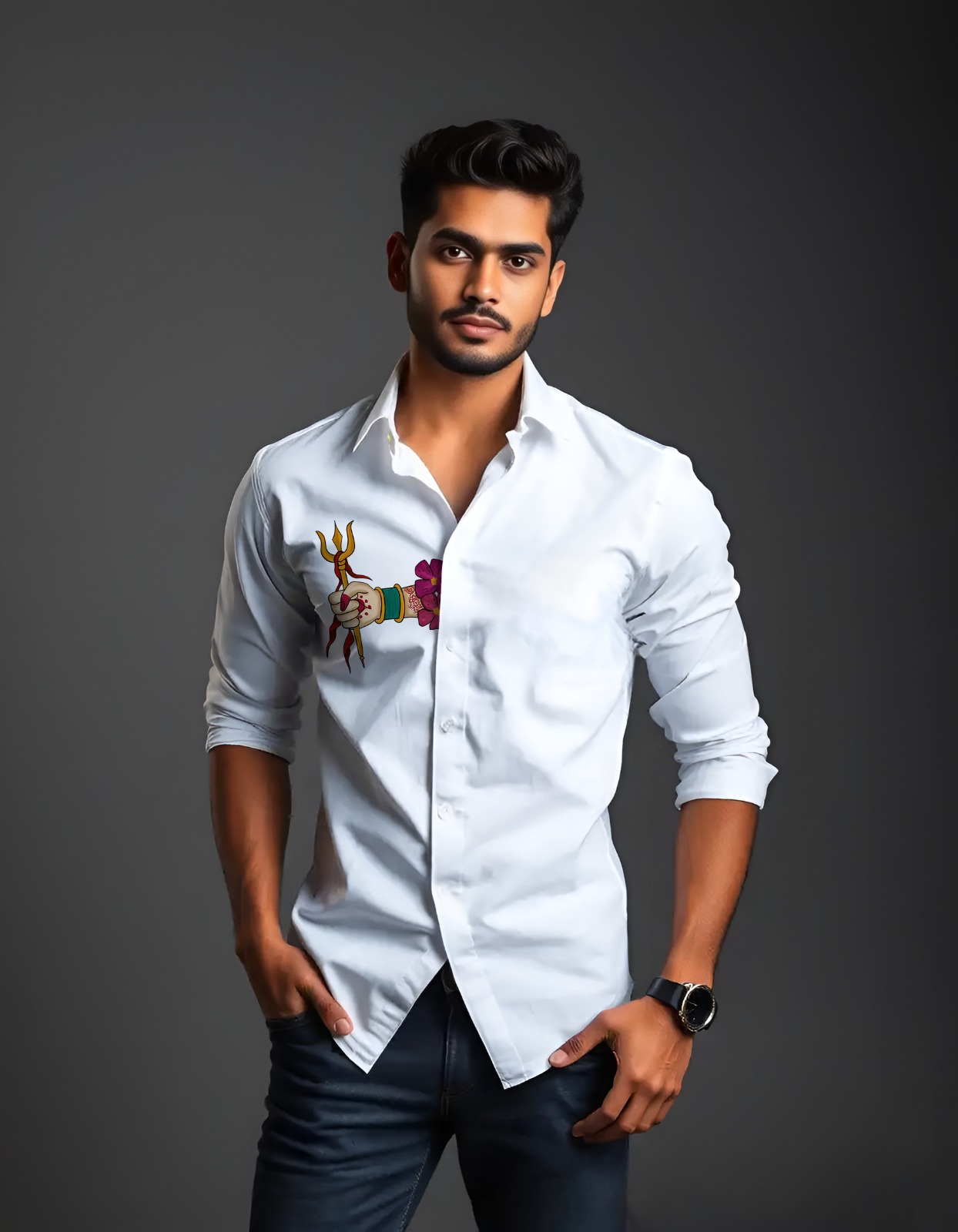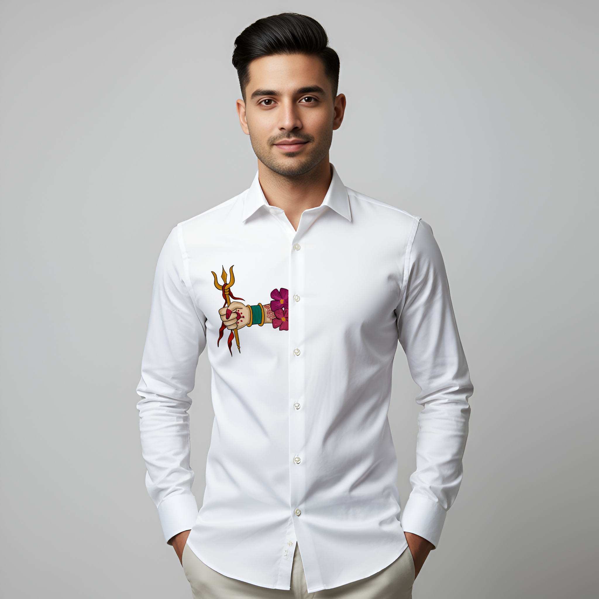 Premium cotton lycra shirt for men with handmade Durga Maa print design. Soft, durable & spiritual – perfect for daily wear, festivals, or gifting.