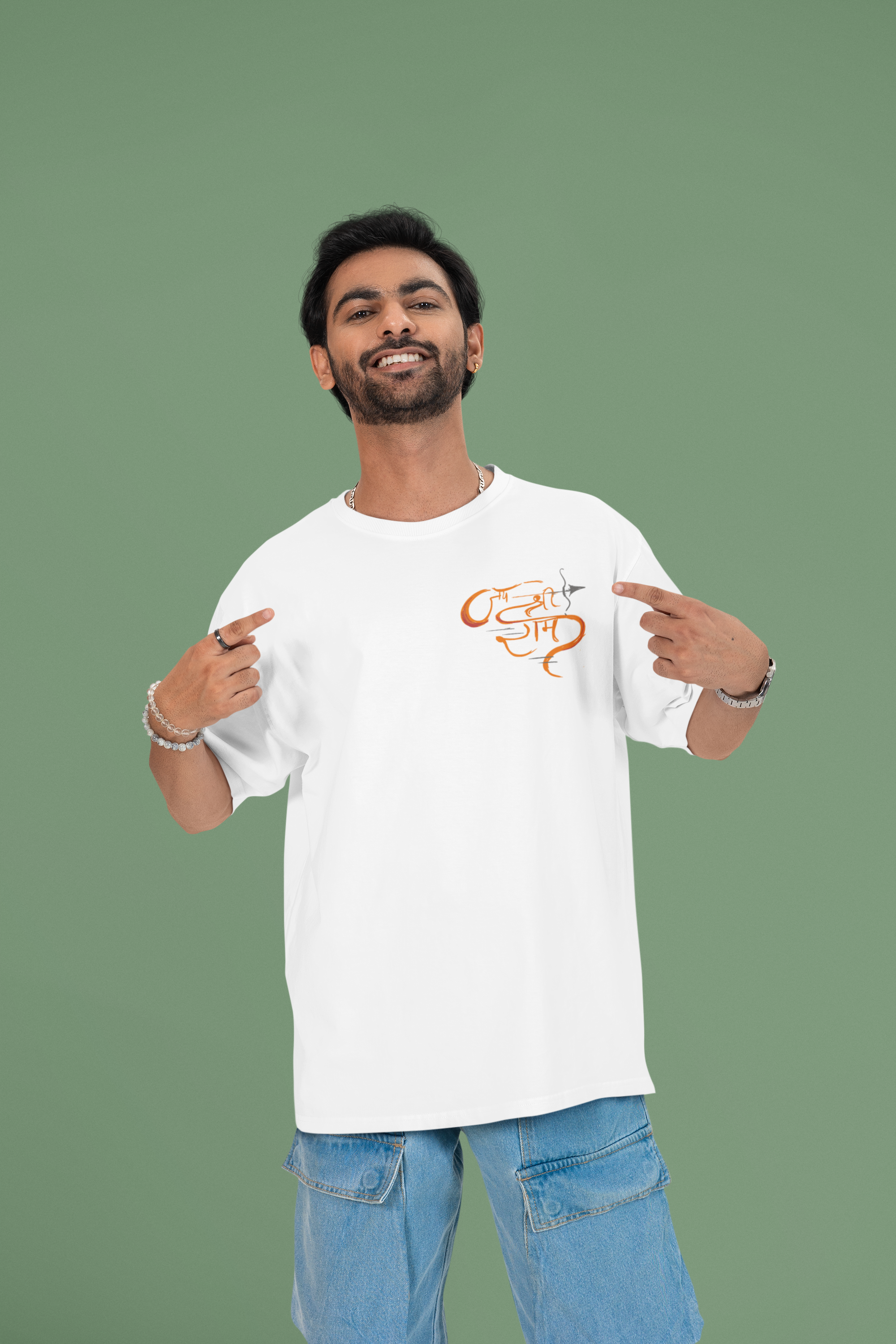 Designed with an urban oversized fit, it pairs effortlessly with jeans, joggers, or traditional bottoms—making it a versatile addition to your wardrobe. The bold “Jai Shree Ram” graphic on the front pays homage to faith and strength, blending spiritual symbolism with streetwear aesthetics.