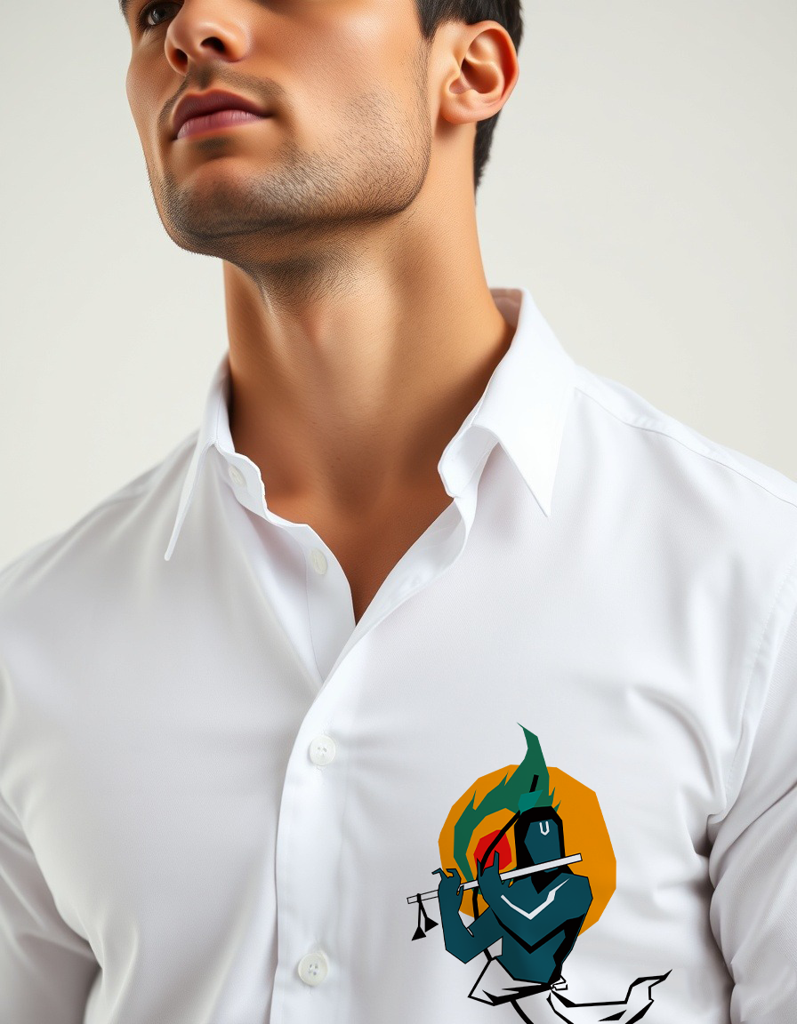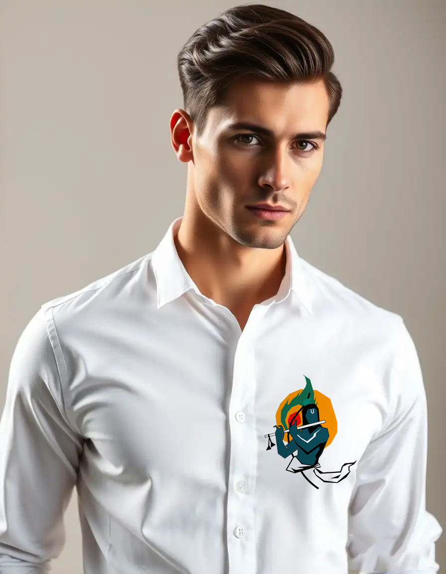 Krishna Handmade Designed Print Shirt crafted in premium cotton-lycra mix for comfort and style. Features unique Krishna artwork print, perfect for festive, casual, or cultural wear. Free delivery across India. (Do not iron on print.)